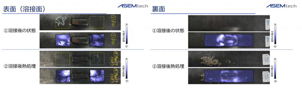 一方、裏面では、溶接部を囲むように磁気的変化が明瞭に観測され、熱処理により、その磁気分布が均一化する傾向が観測されています。このことから、裏面におけるASEM画像は残留応力の分布が主要因であることが示唆されます。今後、溶接時に生じる鋼材の特性変化を、これまでとは異なる新たな視点で評価し、最適な溶接条件の探索手法の確立、および溶接部における破損リスクの予知を目指していきます。